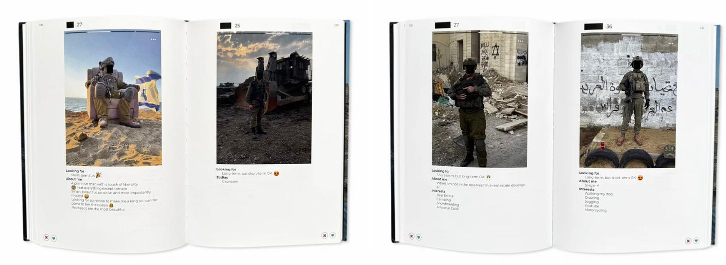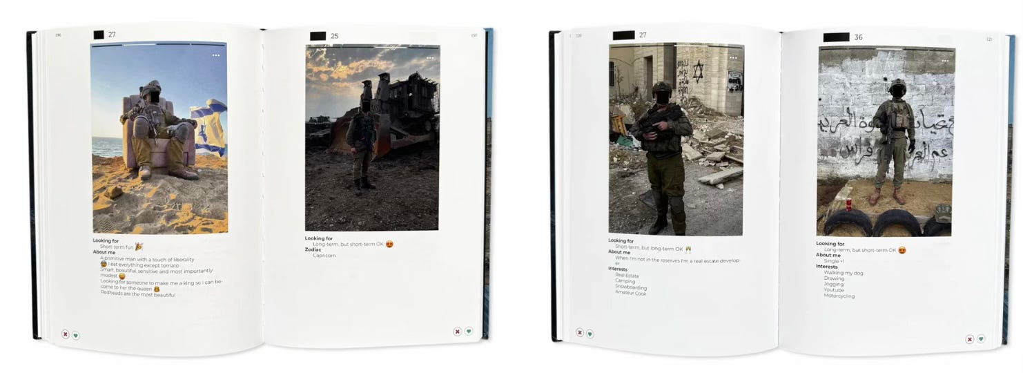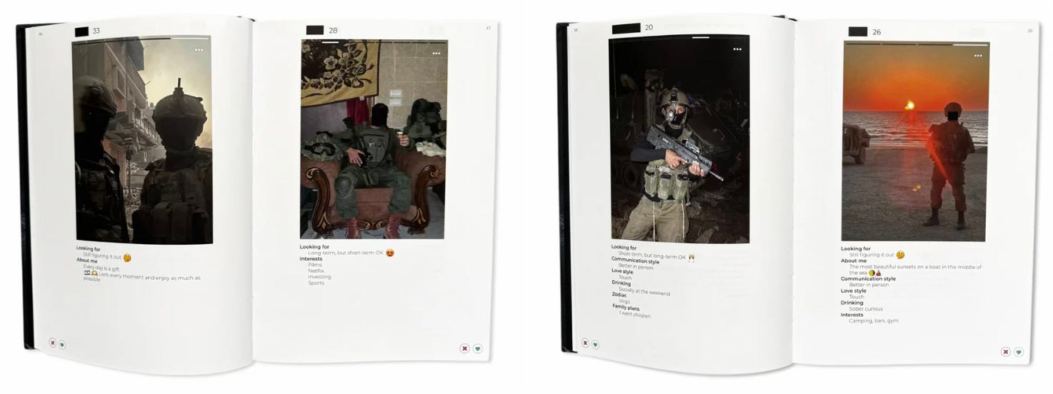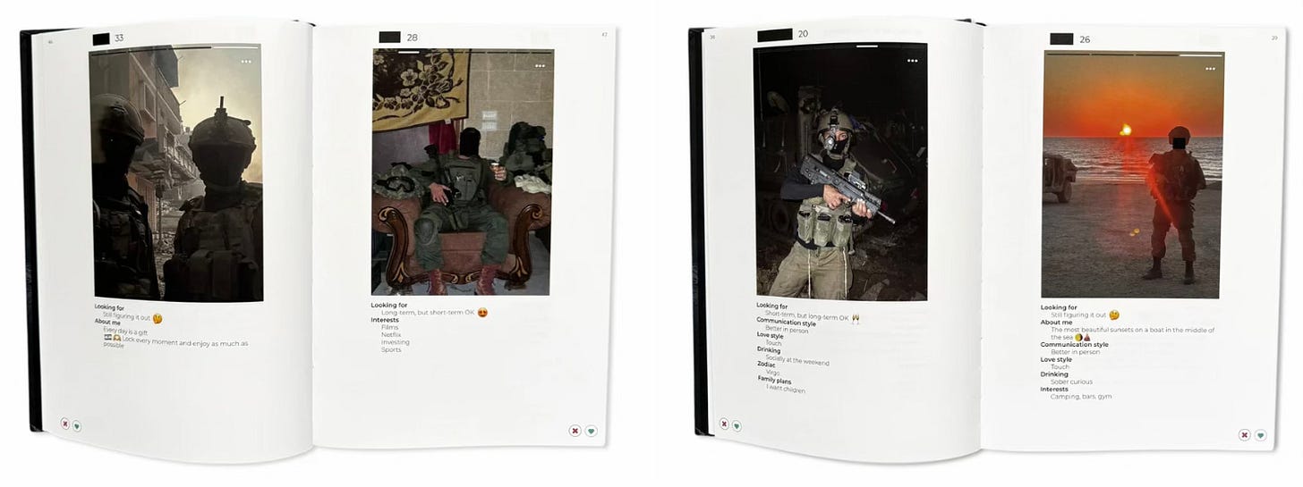 The publication is a forensic visual archive compiled from dating-app profiles used by IDF (Israel Defense Forces) soldiers during operations in Gaza in 2024.Over 300 images are collected, redacted, and recontextualized to examine how war imagery circulates casually, intimately, and largely unchecked.