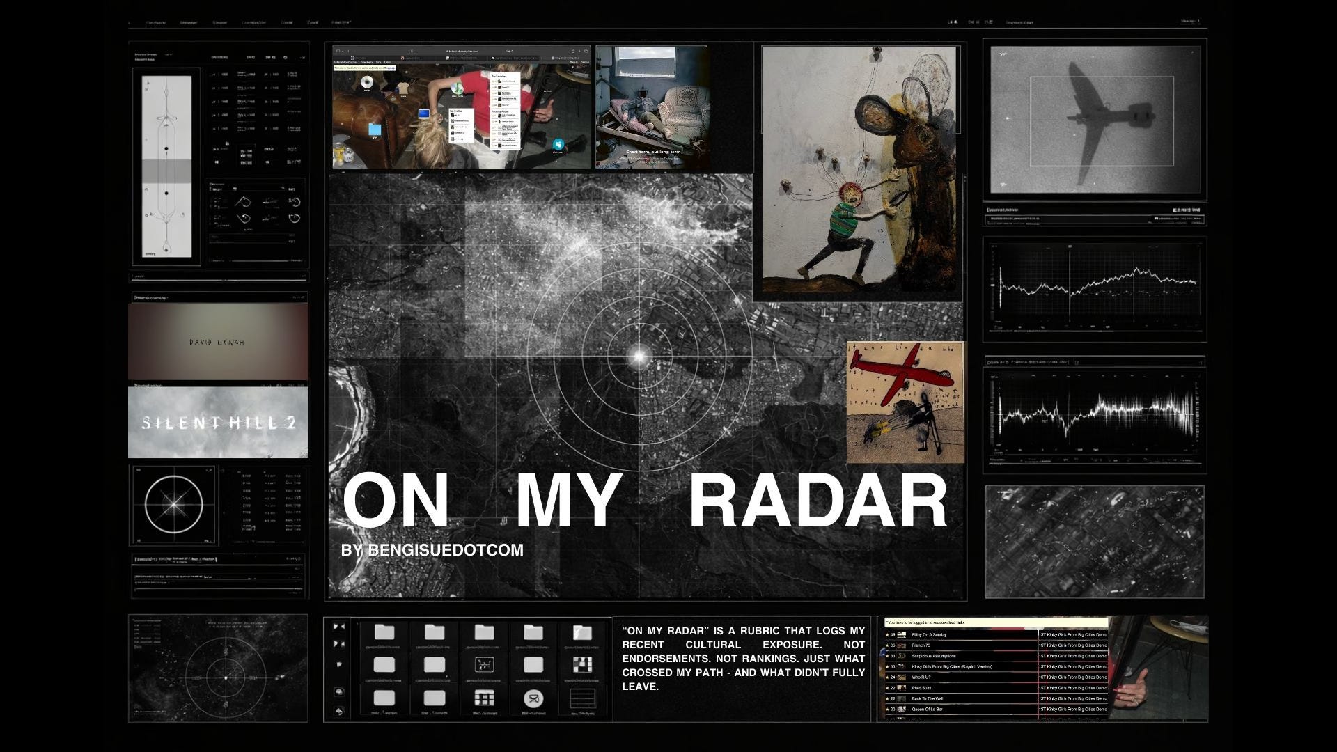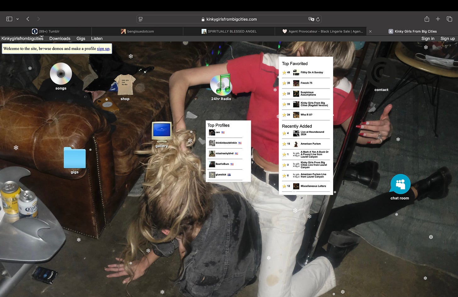 Kinky girls from big cities is an off-platform band circulating through radio, files, and word of mouth. Intentionally hard to find, even harder to place. They are not on streaming platforms. Not trying to be. Their website sounds pretty pornographic but once on it, it feels like a non updated, lost place in the whole World Wide Web. It’s inspired by myspace and band forums and also what inspired my Tumblr desktop layout. Circling back to my intention point earlier: I think this rock band specifically is as intentional as it gets nowadays.
